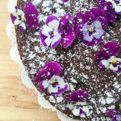 This Single-Layer Chocolate Cake with Edible Flowers is a pretty and simple chocolate cake that can be whipped up when you have the need or craving for chocolate cake.  No need for frosting for this elegant cake as it is decorated with confectioner’s sugar and edible flowers.